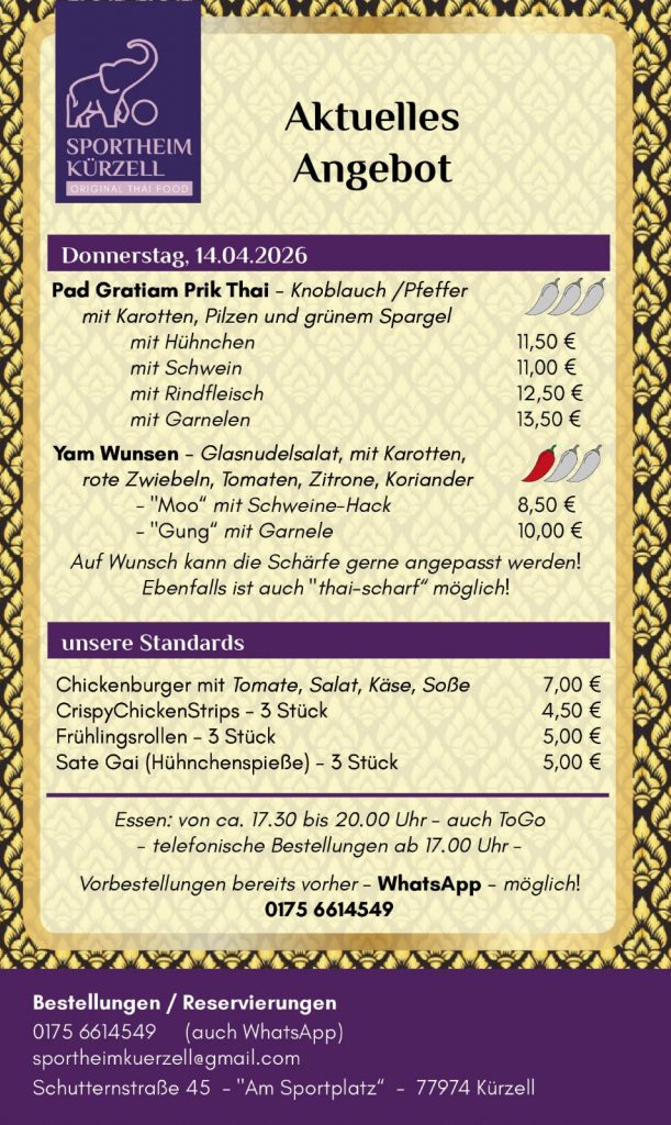 Immer Dienstags und Donnerstags stehen in Abhängigkeit des Sportbetriebes diverse kulinarische Köstlichkeiten auf dem Plan!