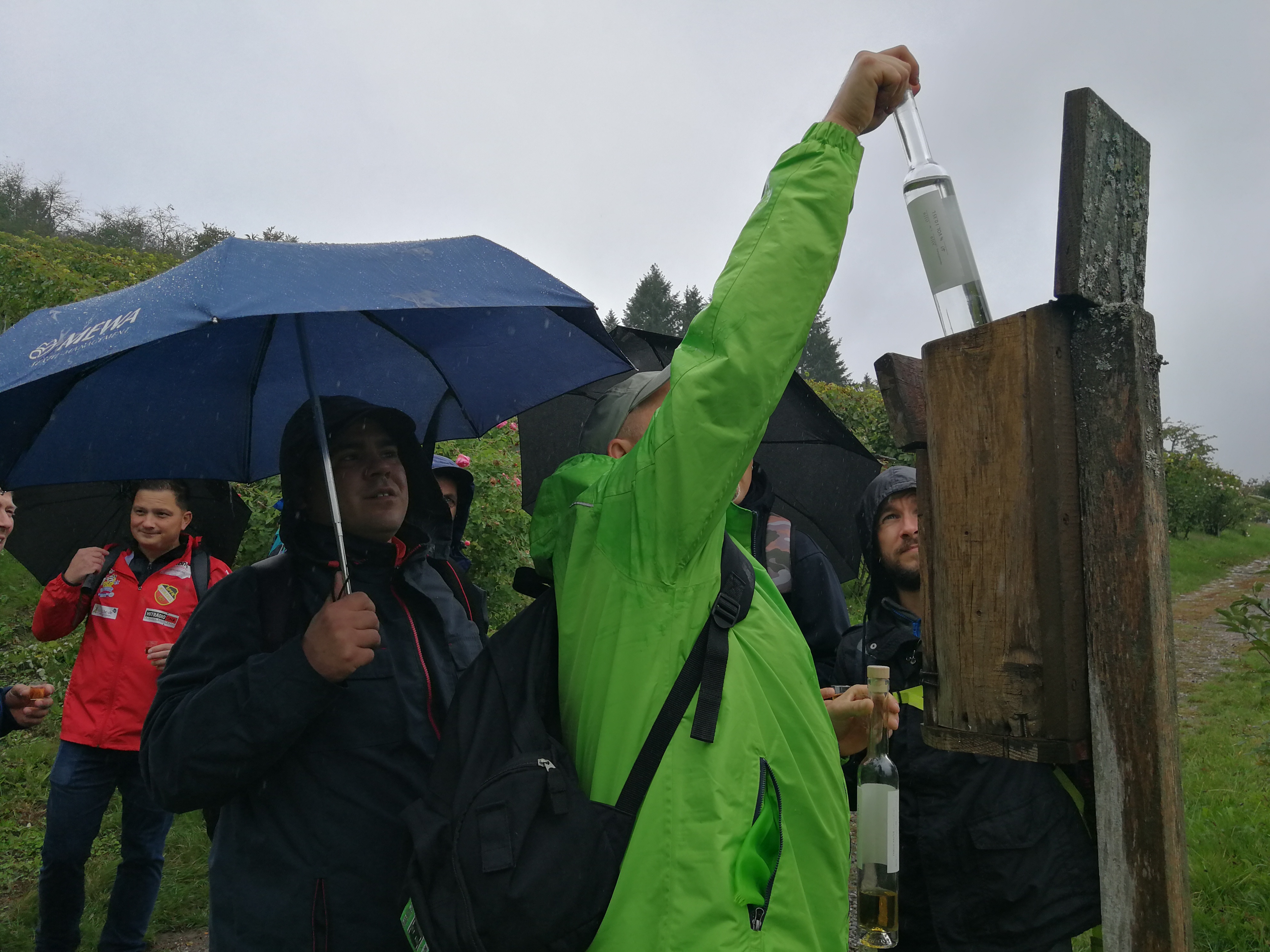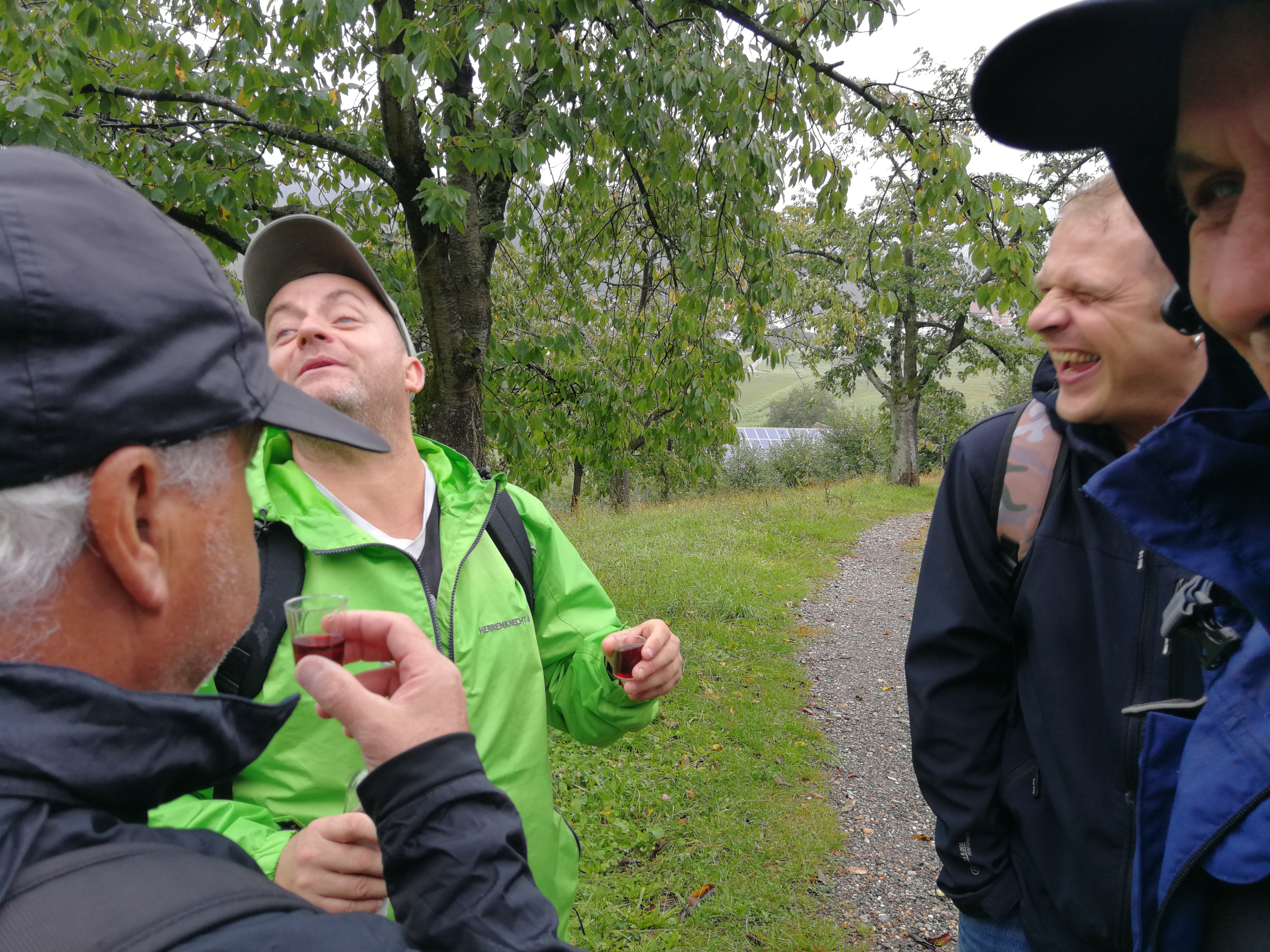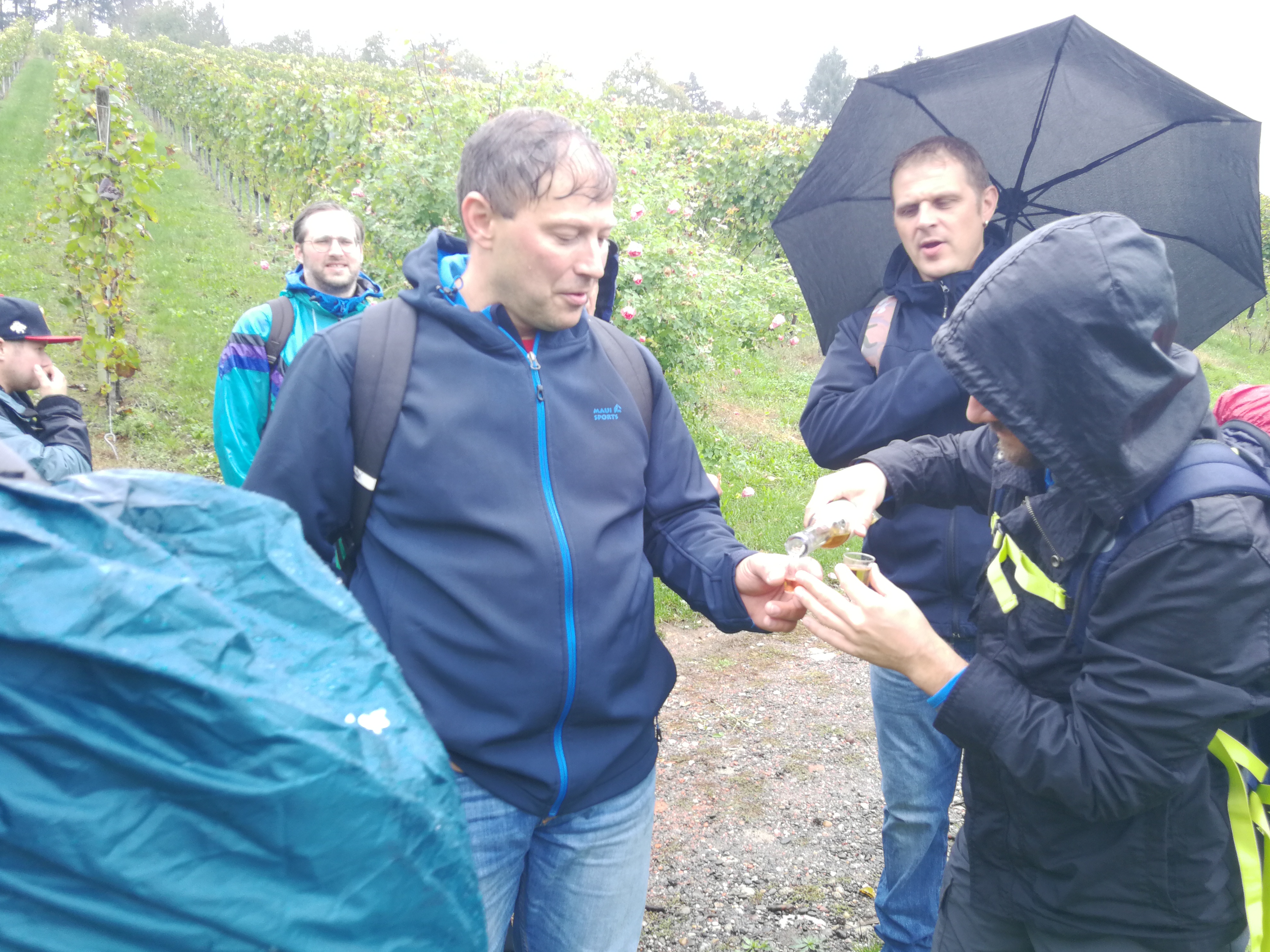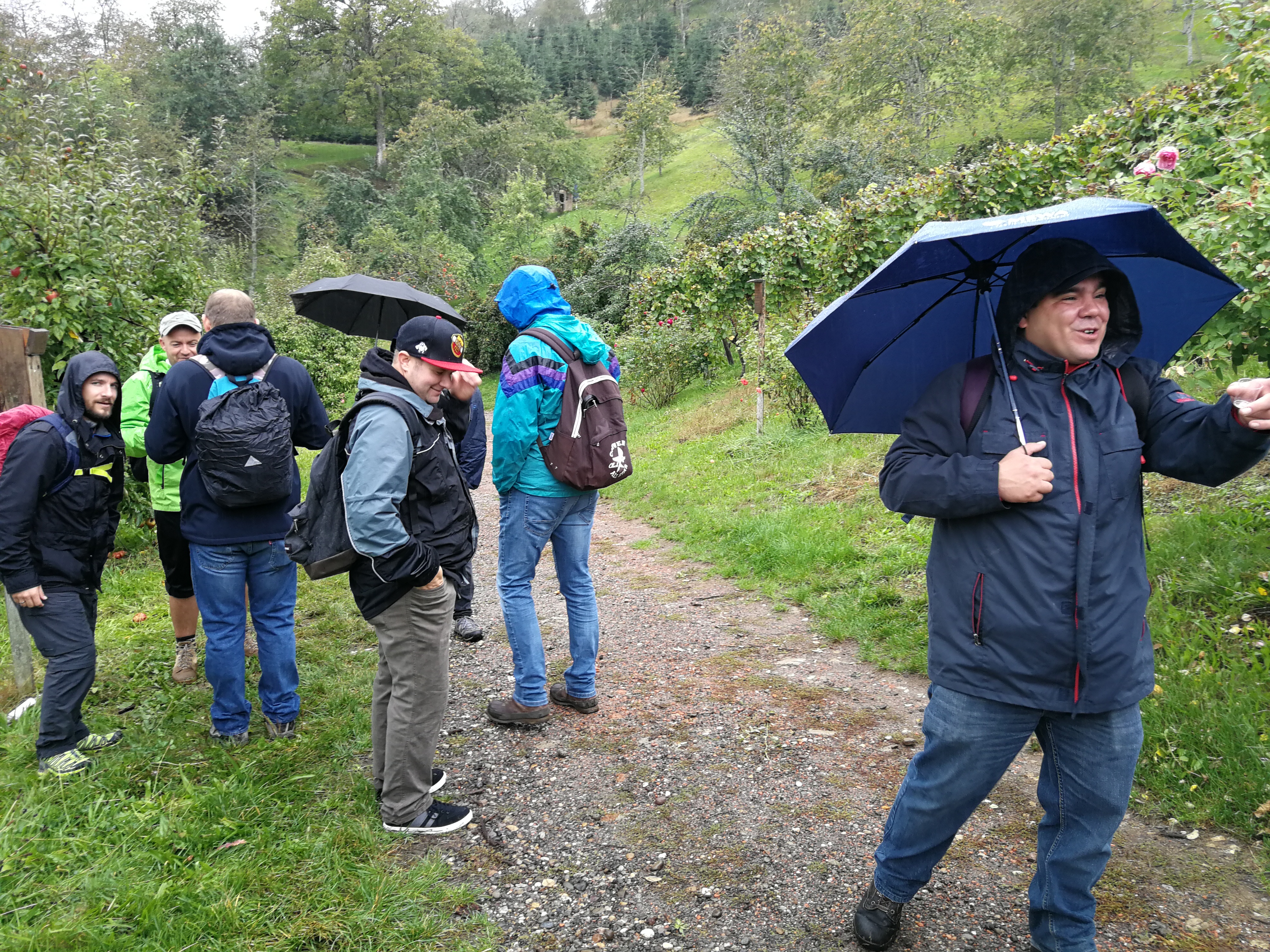 Mit Regenschirmen bewaffnet durchquerte man die 14 km Wald und Wiese und scheute auch manches Schnäpschen nicht.