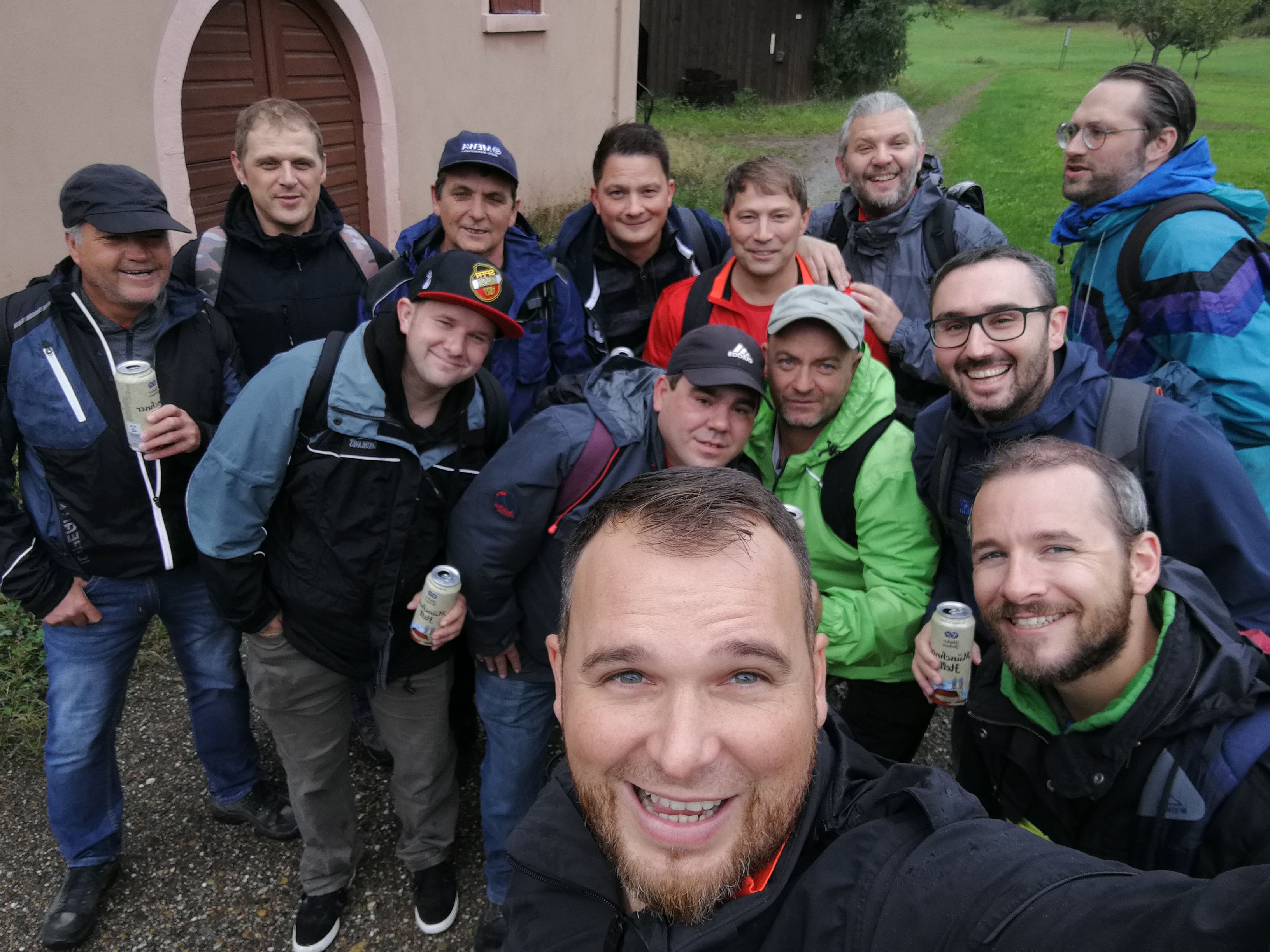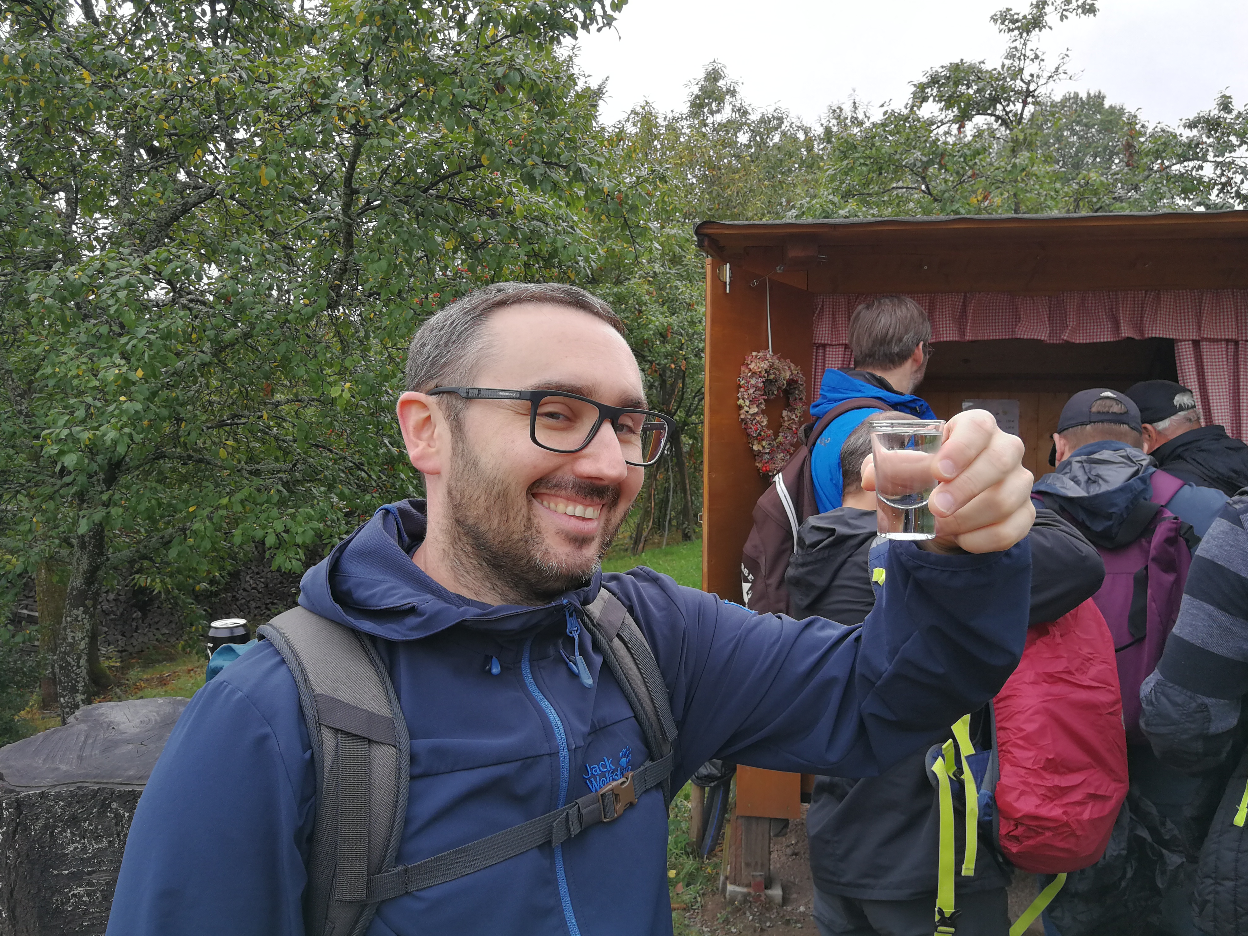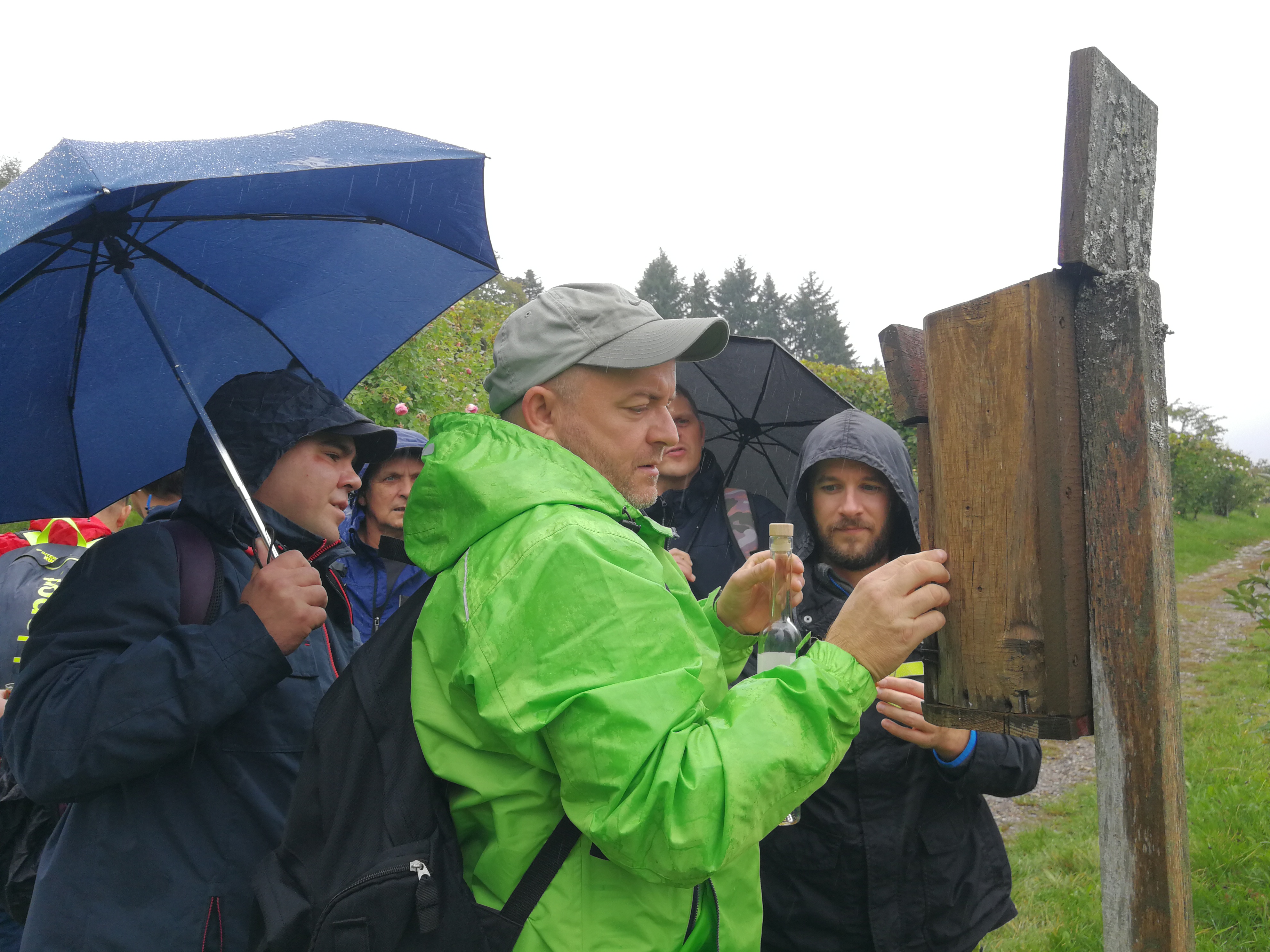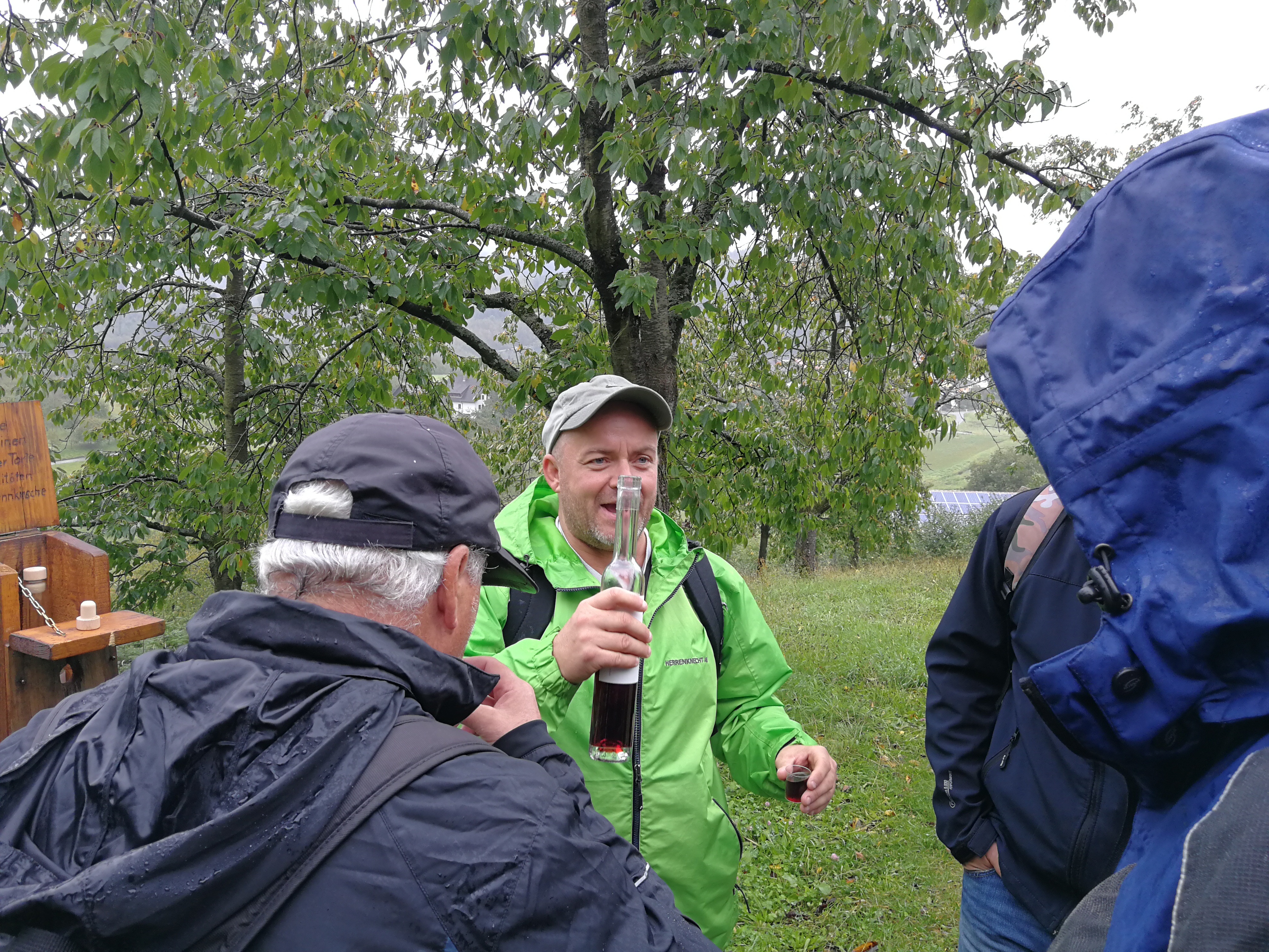 Mit Regenschirmen bewaffnet durchquerte man die 14 km Wald und Wiese und scheute auch manches Schnäpschen nicht.