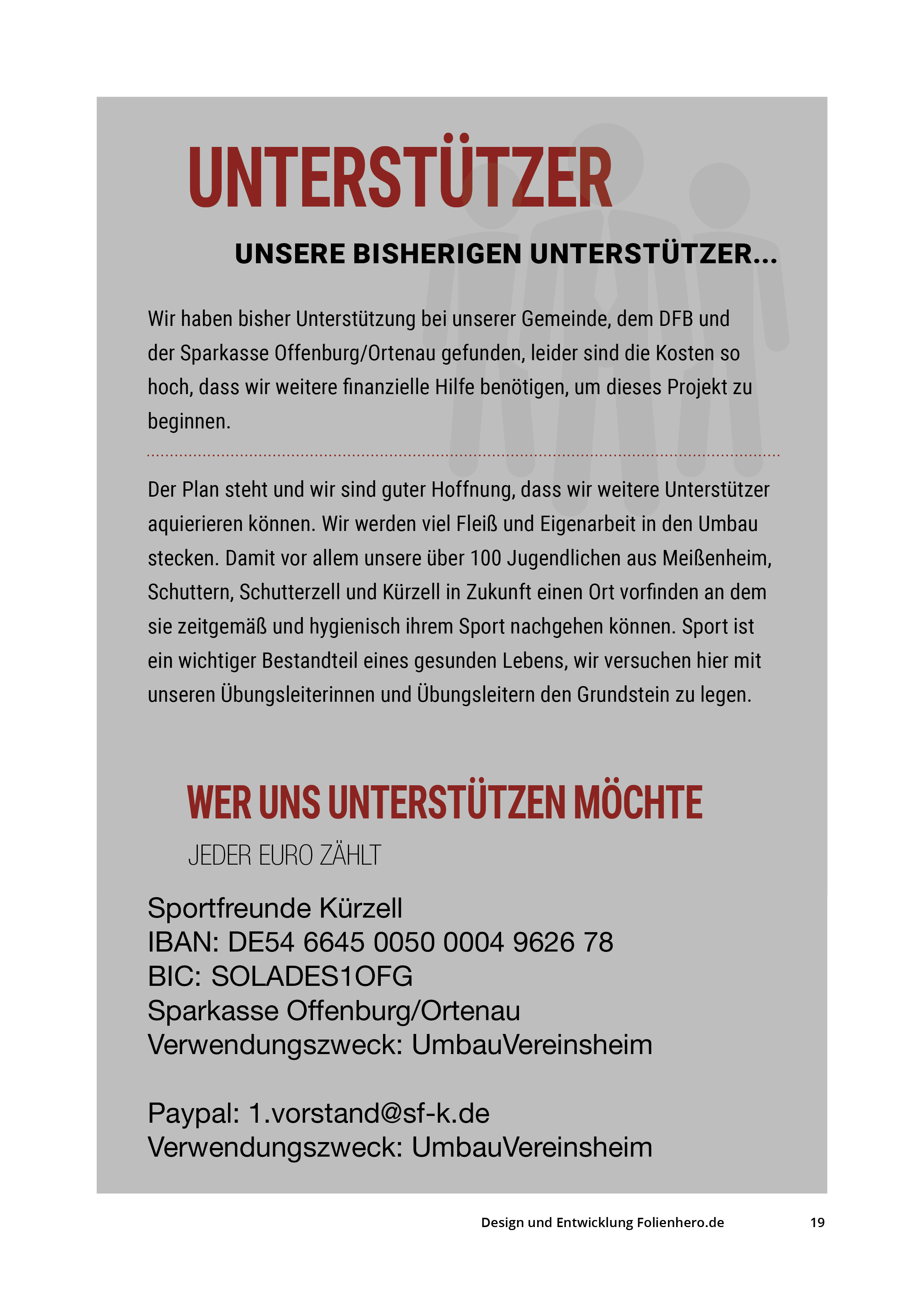 Die Broschüre soll einen Einblick in unser Projekt: „Umbau Vereinsheim“ geben. Wir möchten mit dieser Info-Broschüre auch Spendengelder sammeln um einen Start 2021 zu ermöglichen.